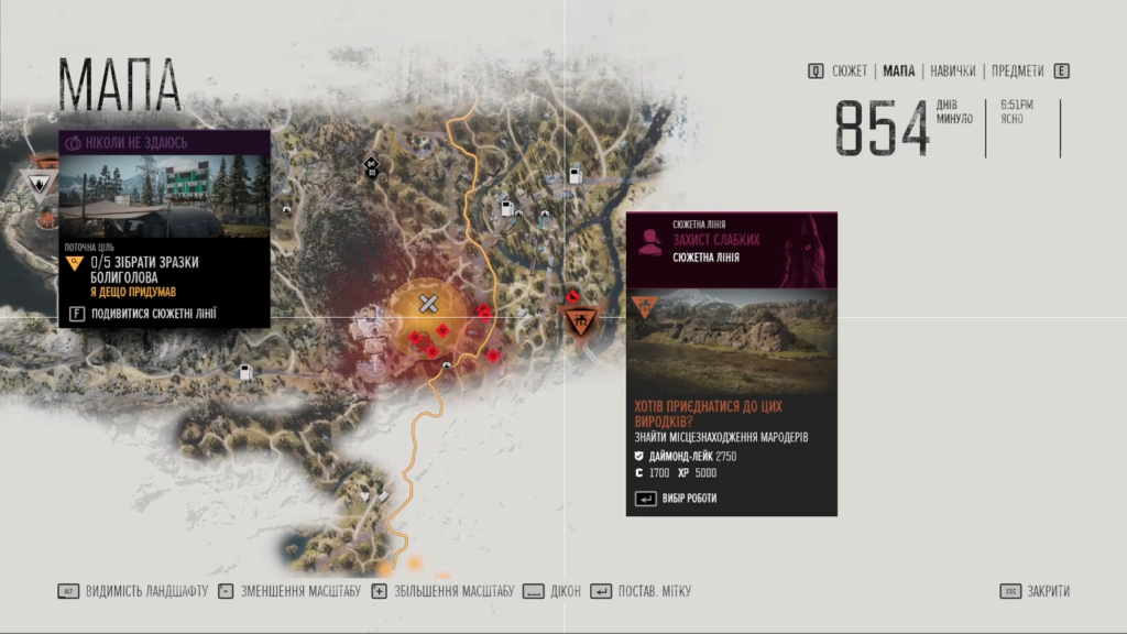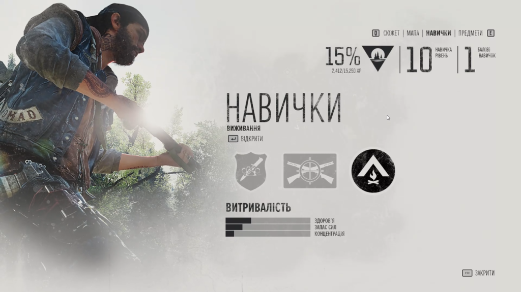 З навичками теж просто, але трохи довше. За виконання завдань і вбивство противників наш персонаж отримує досвід і, відповідно, підвищує свій рівень. Кожен раз, коли ми підвищуємо рівень, наш герой отримує очки навичок, які ми можемо витратити в одній з трьох категорій – Ближній бій, Стрілецький бій і Виживання. Кожна категорія відповідає своїй назві і містить навички які однозначно допомагають нашому персонажу ефективно виживати в новому і небезпечному світі.