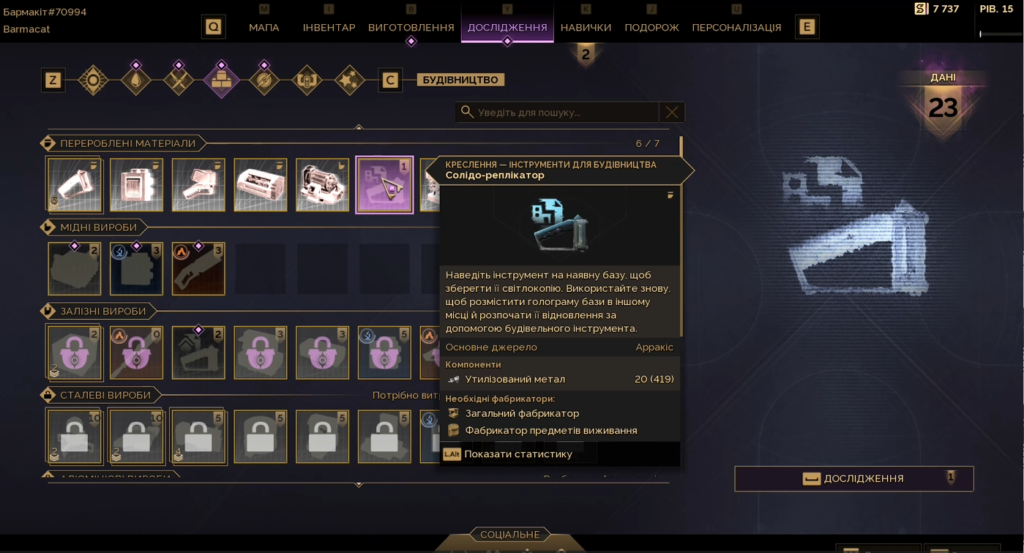 Схема відкриття креслень для елементів будівництва і функціональних верстатів аналогічна до Conan Exiles – ви їх вивчаєте в меню досліджень. Однак окремі креслення і дизайни ви можете як купити у фракційних торговців або на ринку між гравцями, так і отримати в якості винагороди за виконання завдань. Ну і звісно ж разом з наборами сезонного пропуску також можна знайти щось цікавеньке, але вже за реальні гроші.